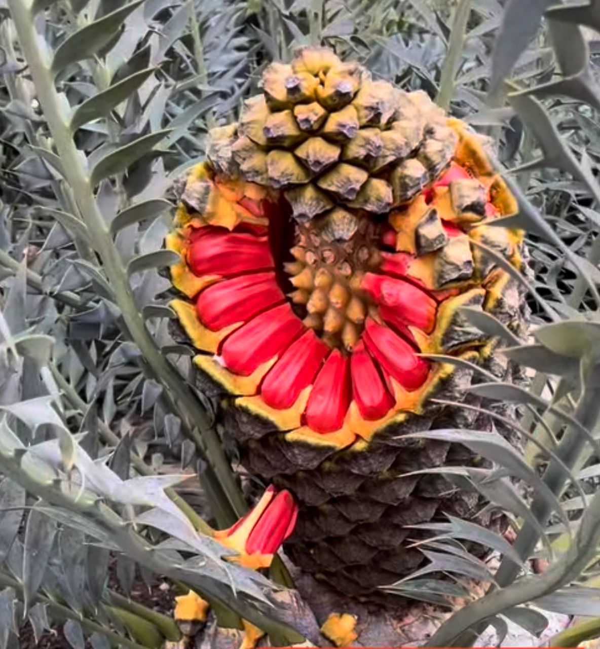 • Female cones are large and pineapple-like; male cones are slender and tubular.