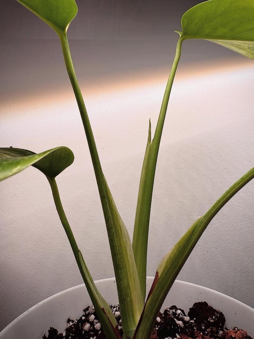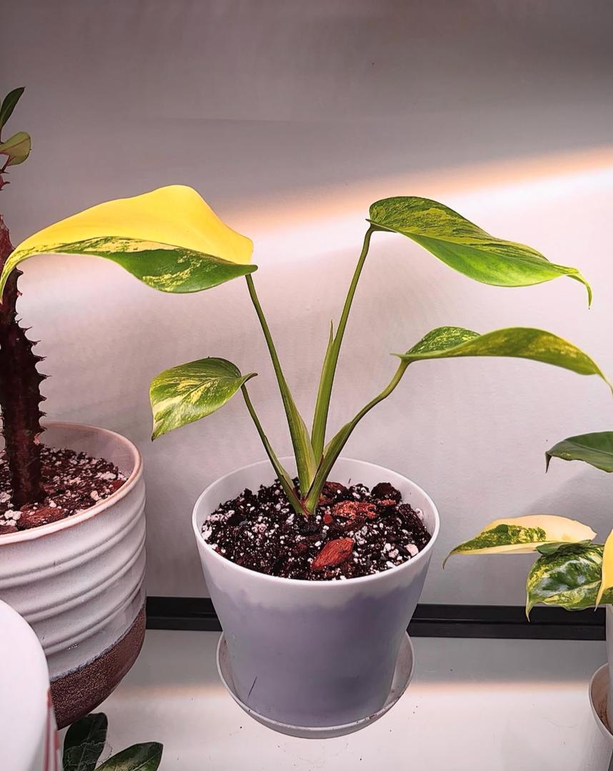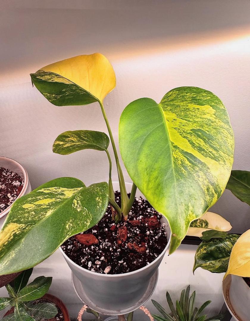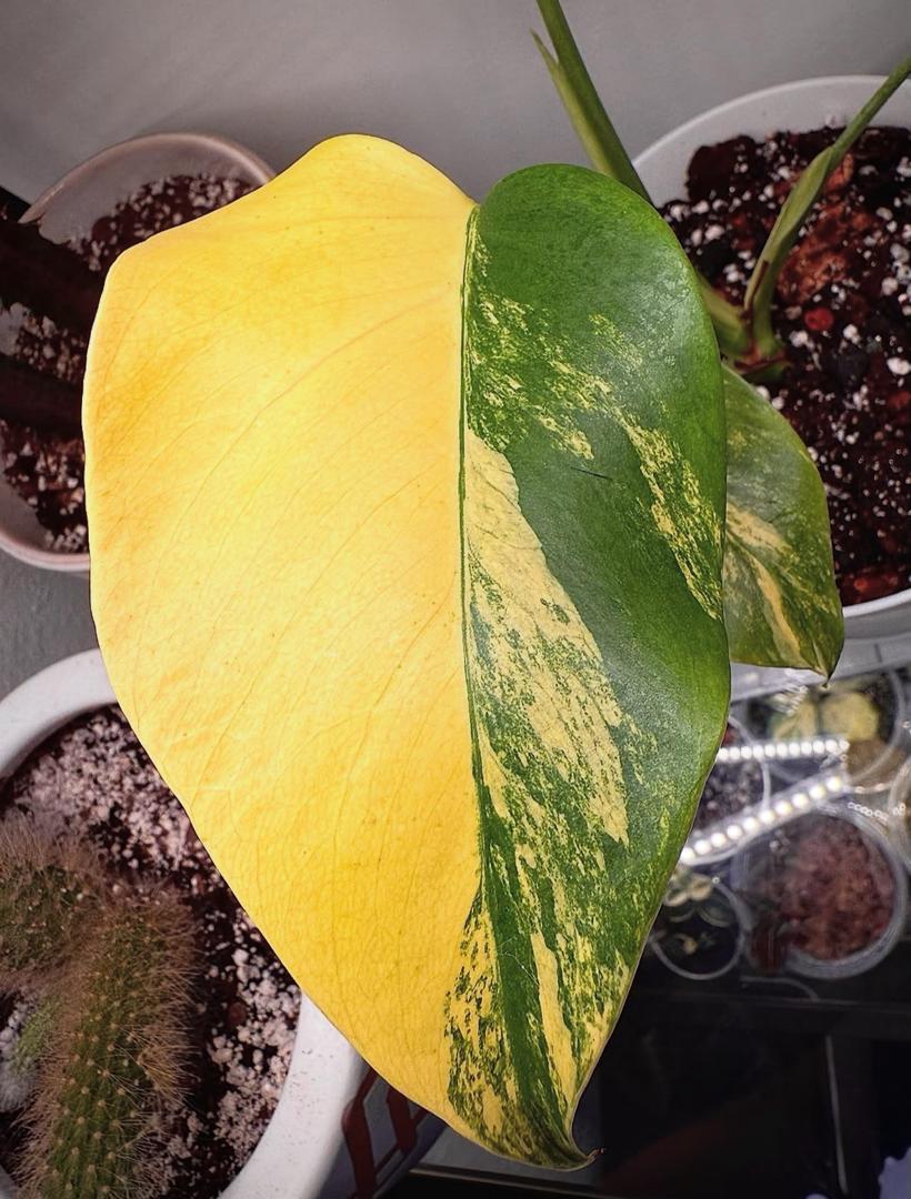 Some variegation mutations are temporary due to instability, with potential for non-variegated growth to outgrow variegation. If you notice two to three completely green or completely yellow leaves emerging consecutively, prune back to the last partially variegated leaf to encourage balanced variegation in subsequent growth. Monstera Deliciosa Aurea Variegated